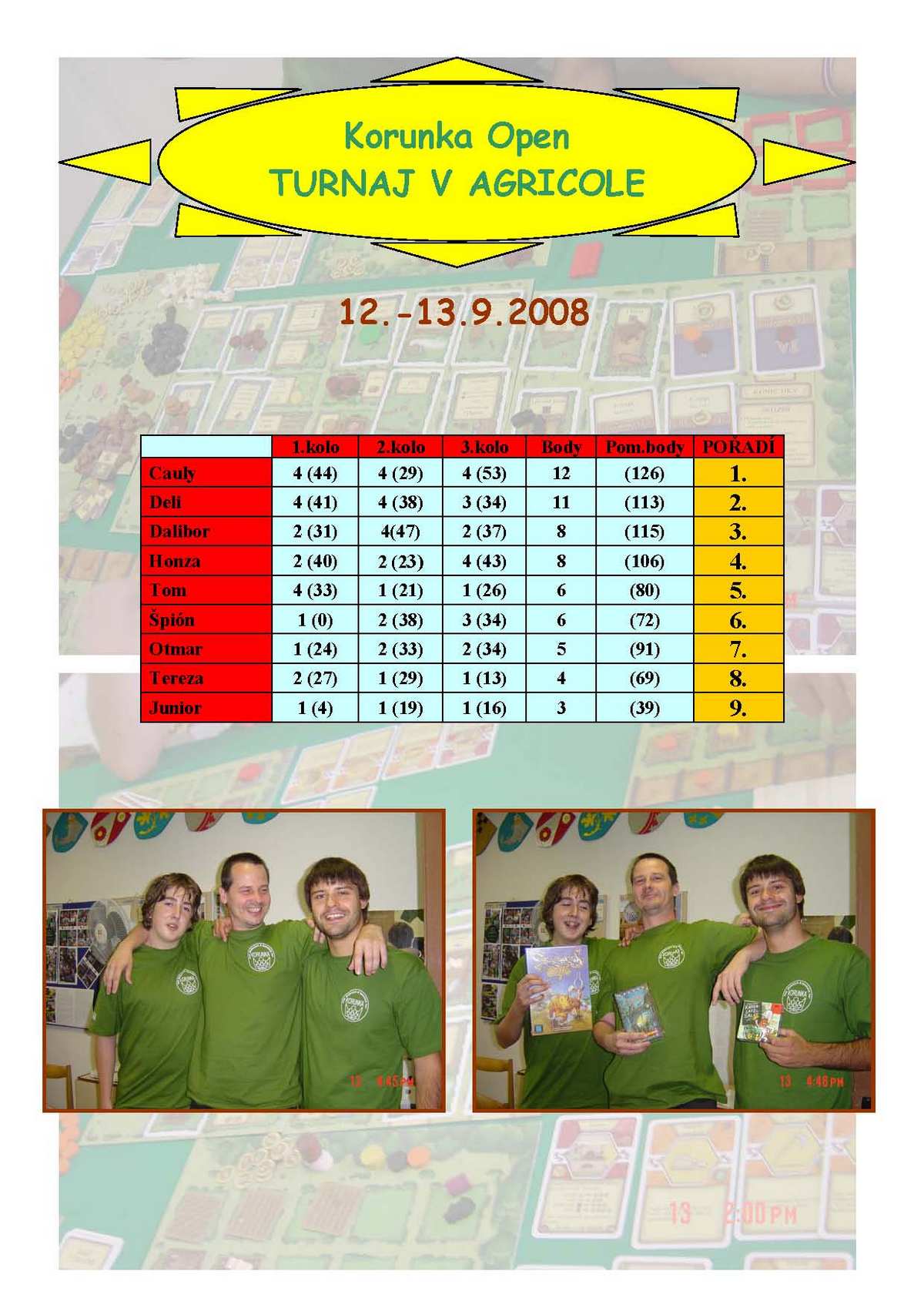 Na první Korunce Open proběhl turnaj v Agricole. Vyhrál Cauly, i když má stále výhrady ke kartám - prý mu chybí "Pálení soupeřových doškových střech", "Vypuštění krtka na soupeřova pole", "Branná povinnost pro soupeřovy potomky", "Zloději dobytka" ....