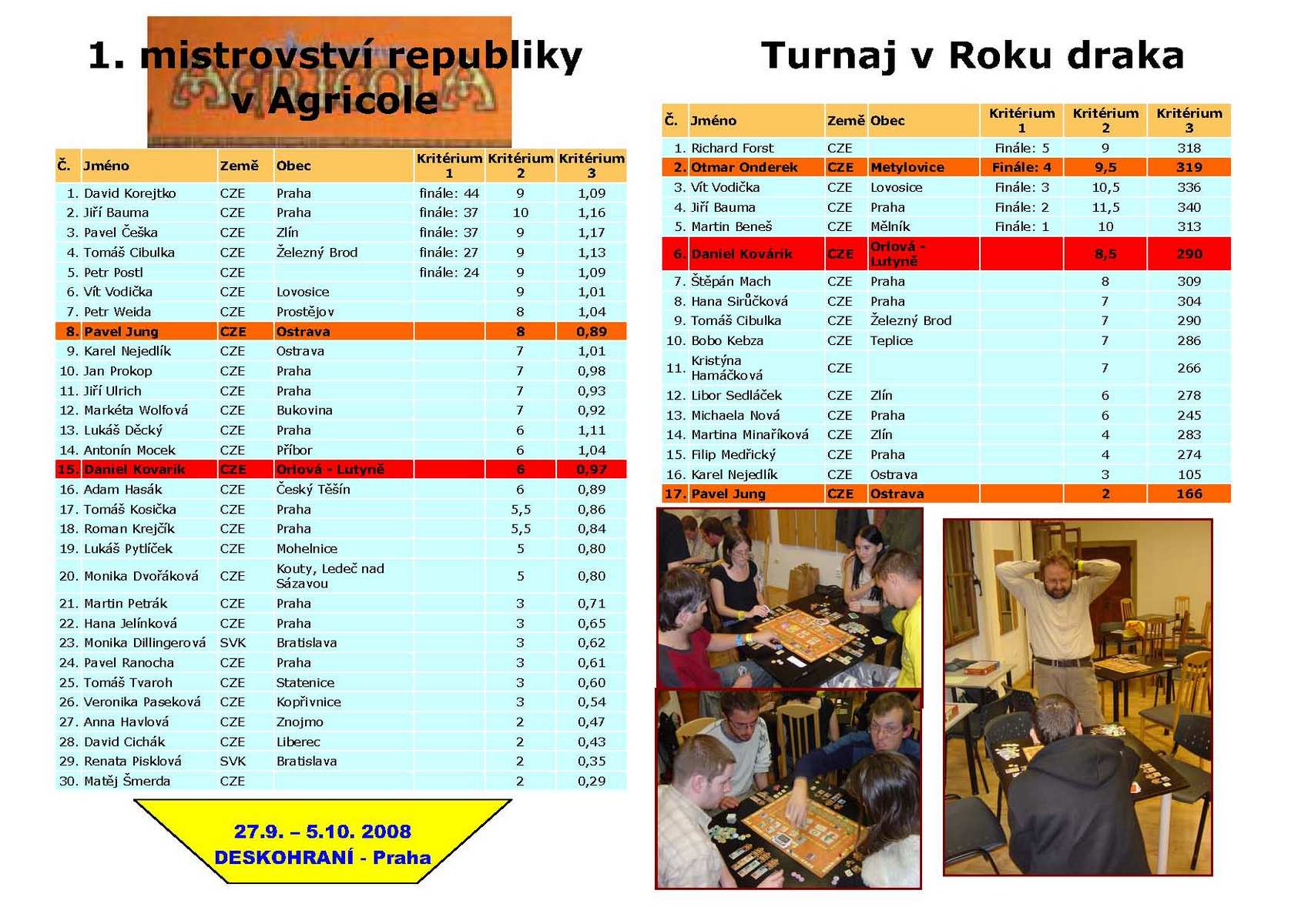 Turnaj v Osadnících s hojnou účastí proběhl v příjemné hospůdce Oáza v Rychvaldu. Oproti očekávání nevyhráli favorité jako Marcel či Deli. Nejlepším Osadníkem se stal Jan Gibl.