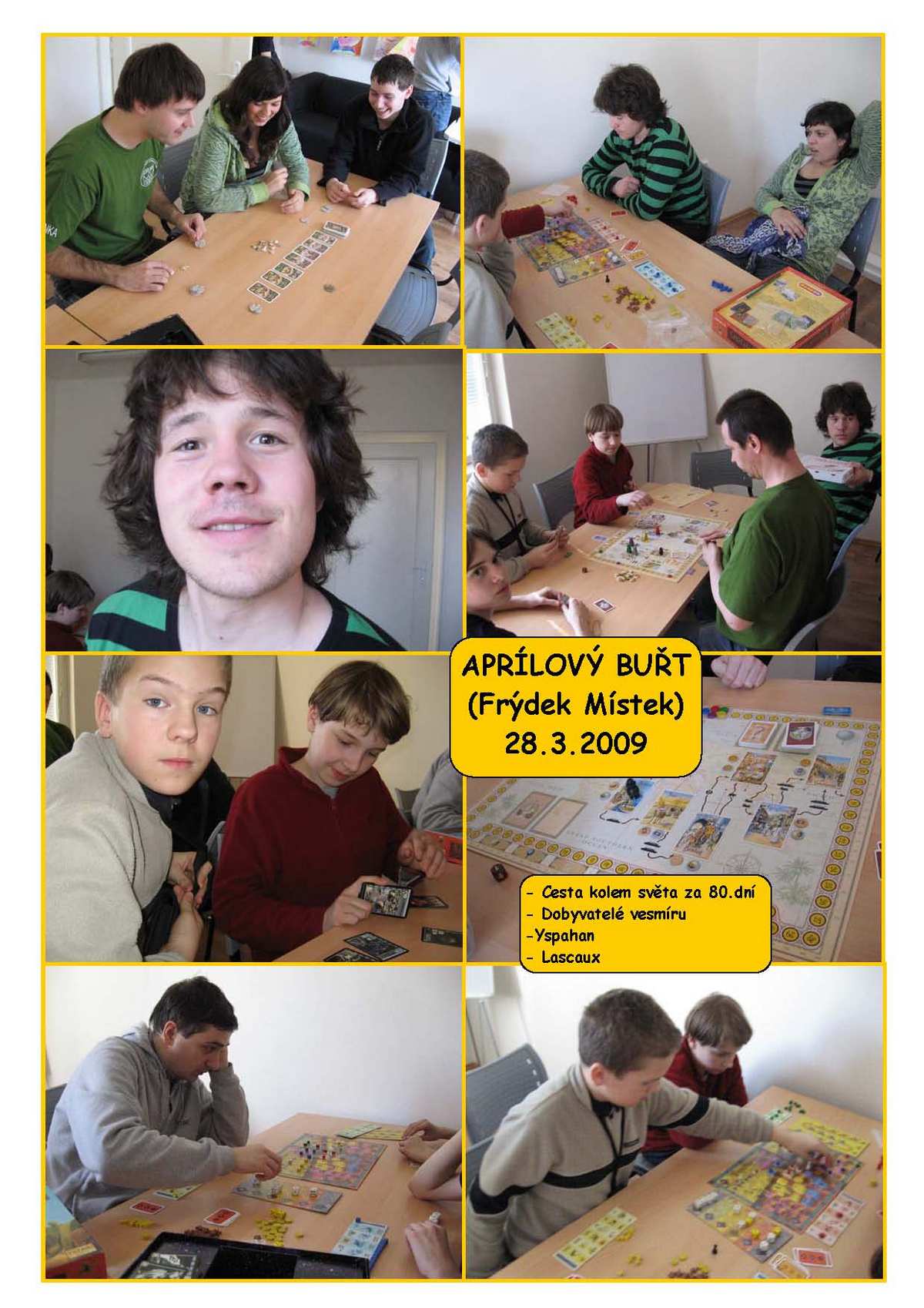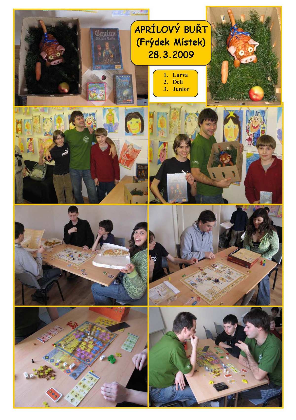 Již tradiční turnaj na přelomu března a dubna pořádali naši přátelé z FM. Vzhledem k vypečeně voňavým cenám si všichni dělali naděje na vítězství. Miniturnájek v Lascaux, Dobyvatelích vesmíru, Cestě kolem světa za 80.dní a Yspahanu, což jsou vše hry od domácích vydavatelů (Albi a MindOK), vyhrál frýdečák Larva, který těsně za sebou nechal Deliho a Juniora. Ale naštěstí si vybral hru, takže na druhého v pořadí zbyla pochoutka masného průmyslu.