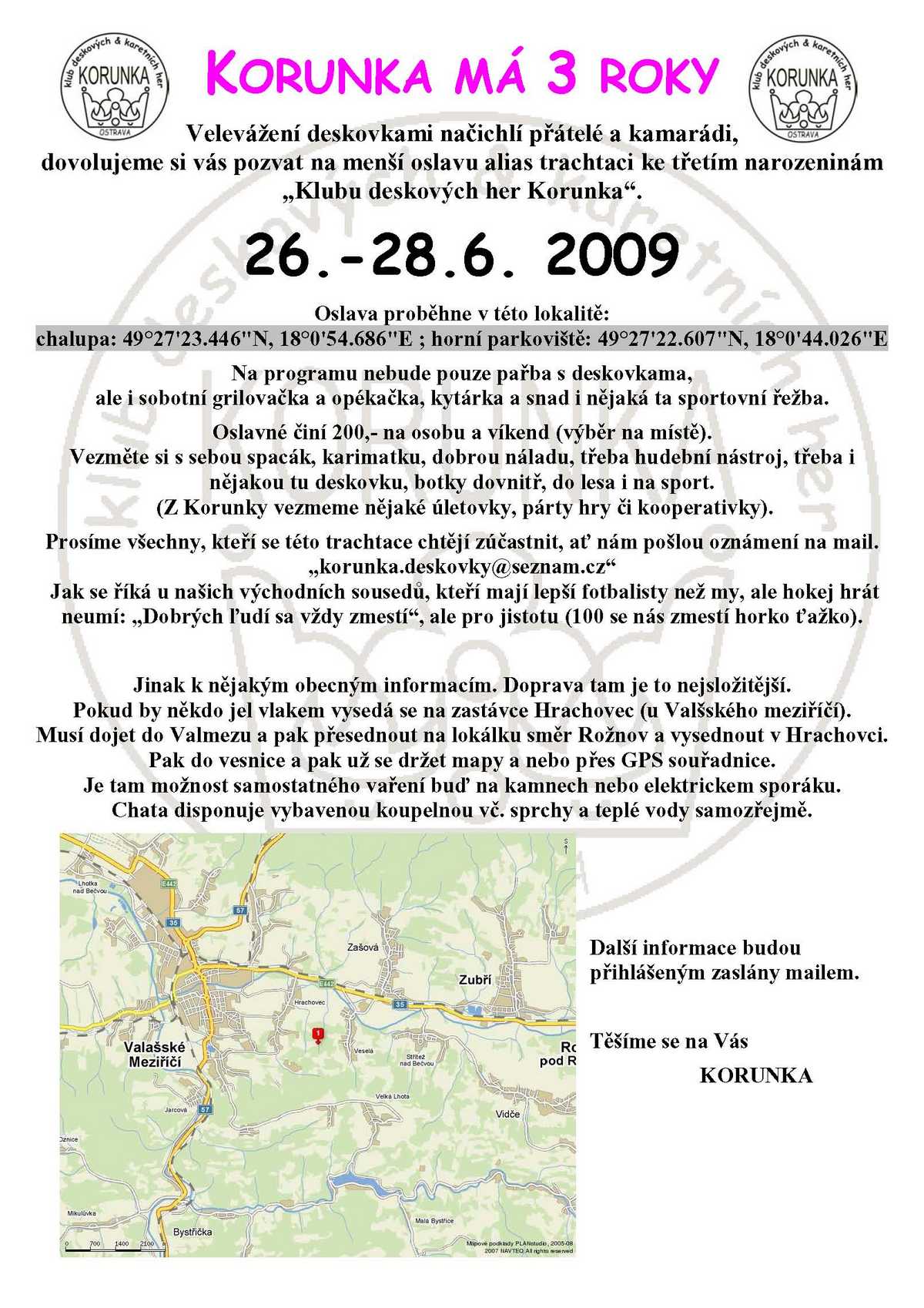 Třetí rok naší "korunkovské éry" ;-))) jsme oslavili poblíž ValMezu. Přijelo i několik celebrit z jiného kraje - Ester, Tom, Aneken, Hrabinho. Nad celou Trachtací držel svou ochrannou ruku Radegast, který ošklivé černé mraky zažehnal a občas přitáhl i sluníčko. Takže se slavilo, hrály hry, opékaly gurmánské speciality. Prostě Trachtace jak má být!!!